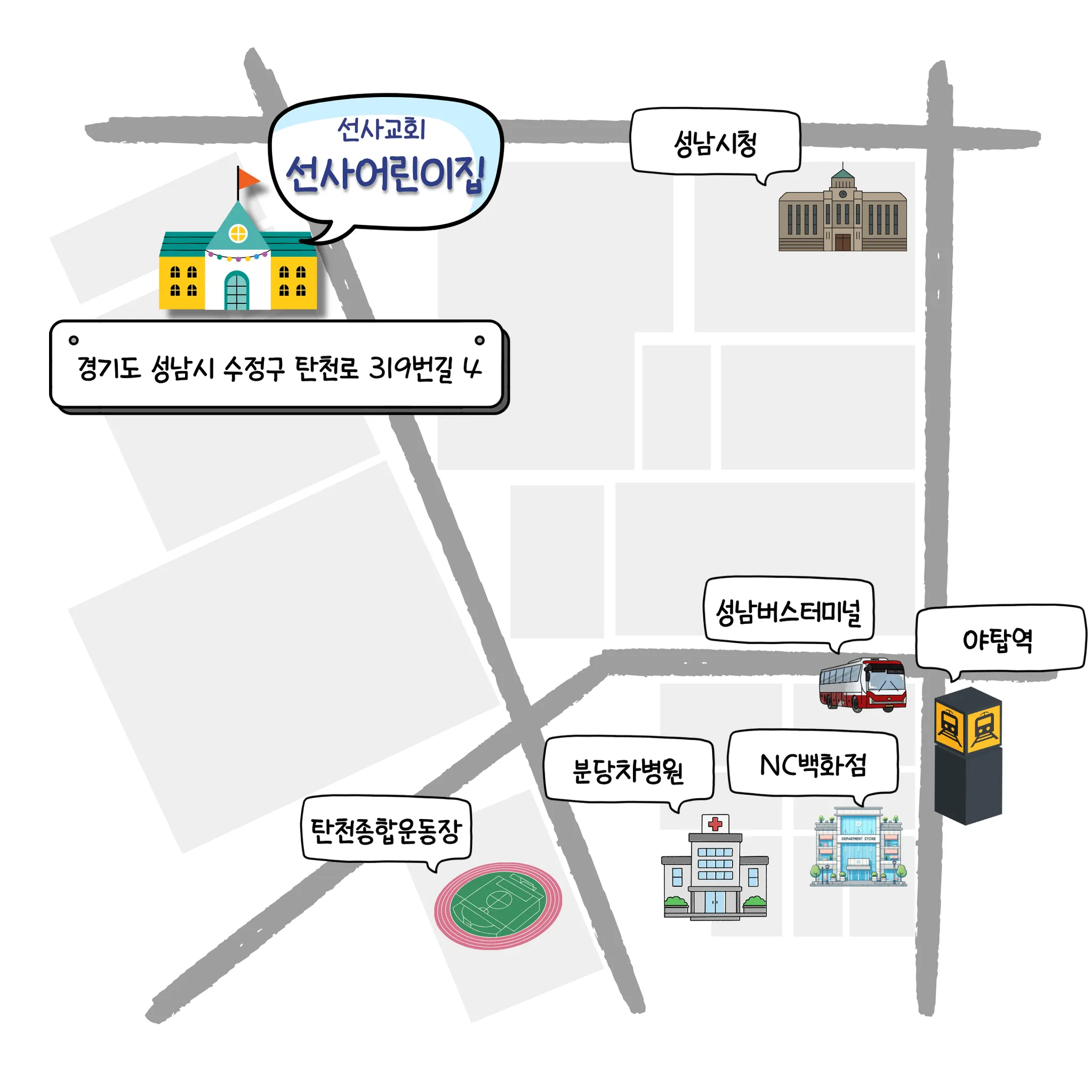 외곡순환 고속도로 이용 시성남IC → 여수교차로 → 성남대로 야탑방면 → 여수삼거리 → 여수대교(동아다리) → 여수대교 앞 사거리 좌회전 → 우측골목 진입 → 선사교회
